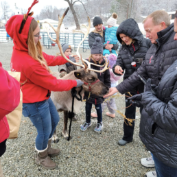 Interaction, petting, and feeding the real reindeer in their pen and barnyard with just your group. Yes, that is right – it is a personalized time for just you and your group.